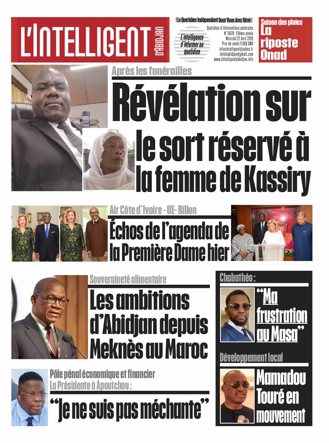 À lire aussi ce que la Première Dame a fait hier ; Les ambitions d’Abidjan depuis Meknès au Maroc dans le cadre de la souveraineté alimentaire; le déroulement du procès d’Apoutchou; Chabathéo qui parle de sa frustration au Masa.