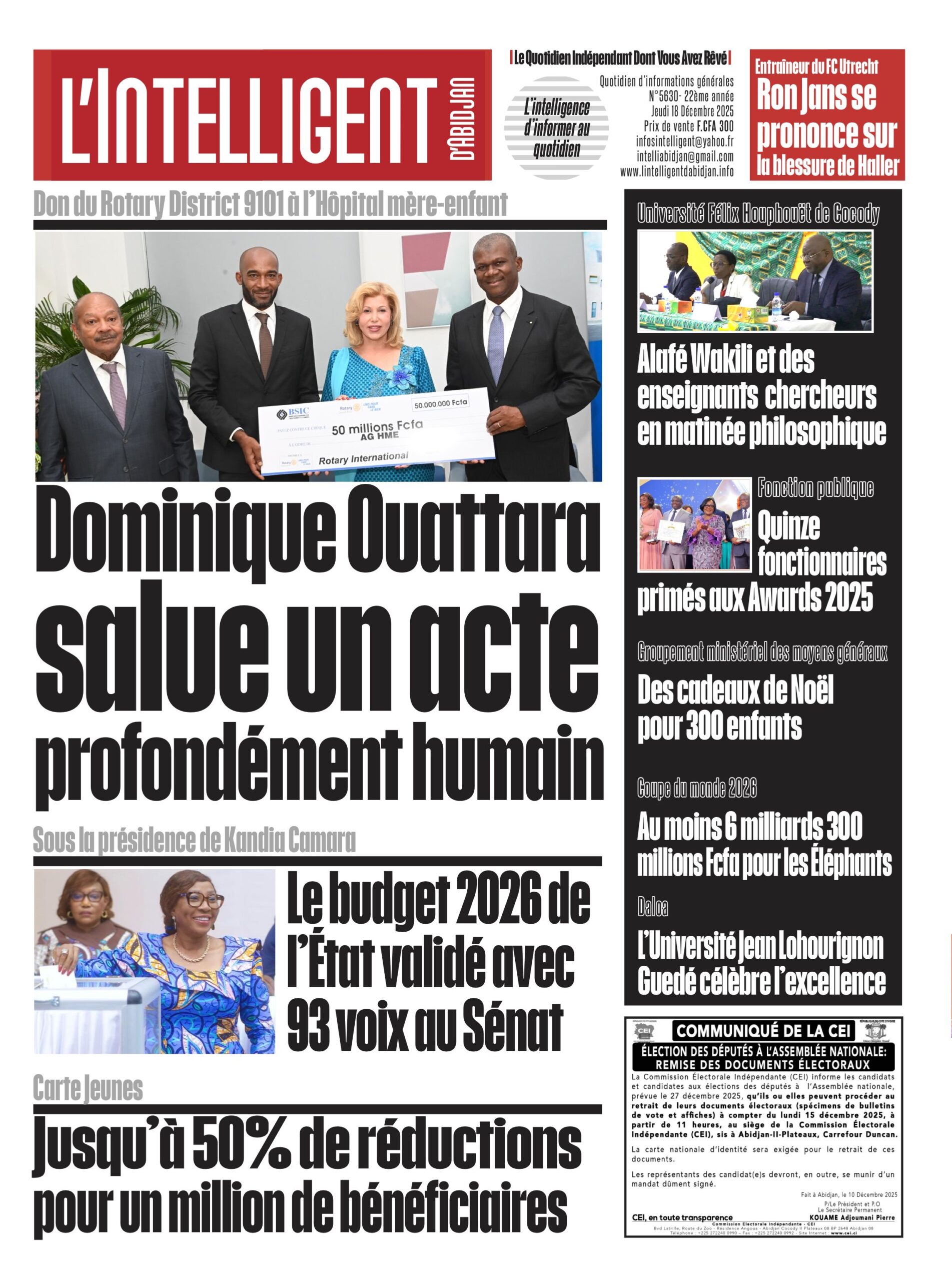 À lire également le budget 2026 de l’État validé avec 93 voix au Sénat sous la présidence de Kandia Camara; Jusqu’à 50% de réductions pour un million de bénéficiaires de la Carte Jeunes; Alafé Wakili et des enseignants chercheurs en matinée philosophique à l’ Université Félix Houphouët de Cocody; Quinze fonctionnaires primés aux Awards 2025 de la Fonction publique; Des cadeaux de Noël pour 300 enfants du personnel du Groupement ministériel des moyens généraux; Au moins 6 milliards 300 millions Fcfa pour les Éléphants à la coupe du monde 2026.