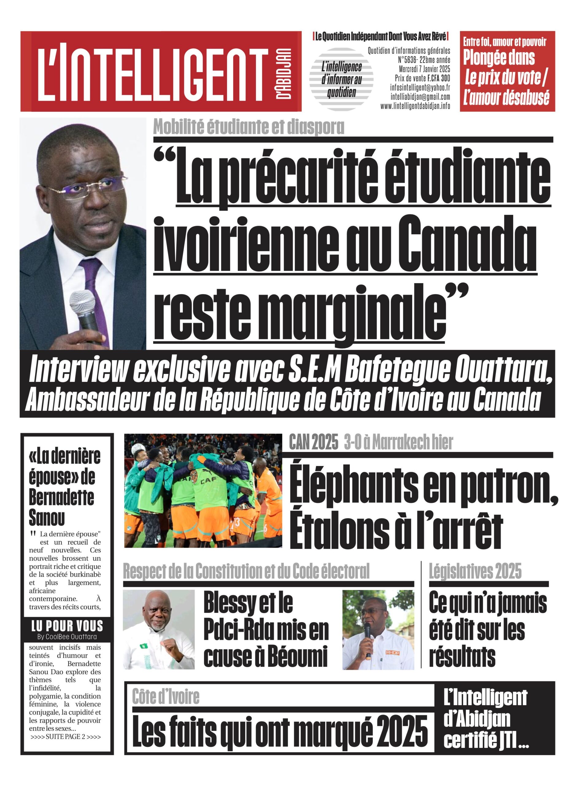À lire aussi CAN 2025 : 3-0 à Marrakech hier , Éléphants en patron, Étalons à l’arrêt; Ce qui n’a jamais été dit sur les résultats des législatives 2025; Blessy et le Pdci-Rda mis en cause à Béoumi pour le non-respect de la Constitution et du Code électoral; Les faits qui ont marqué 2025 en Côte d’Ivoire notamment L’intelligent d’Abidjan certifié JTI.