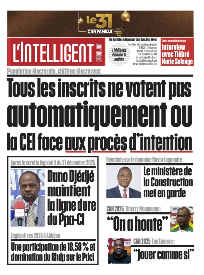 À lire également Dano Djédjé  maintient  la ligne dure du  PPA- CI  après le scrutin législatif du 27 décembre 2025; Participation de 18,58 % et domination du Rhdp sur le Pdci  aux législatives 2025 à Abidjan; le ministère de la Construction met en garde contre les opérations de remblayage sur le domaine fluvio-lagunaire à Abidjan; ce que Thierry Mouyouma  et Faé Emerse ont dit  dans le cadre de la  CAN 2025.